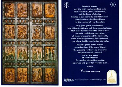 The Holy Door- The Lord Jesus is the door of our salvation, a fact which is symbolized through the spiritual practice of passing through specially designated doors of various churches. The Ordinary Jubilee began with the opening of the Holy Door at St. Peter's Basilica on December 24, 2024. This door is also called the "Door of the Great Pardon". Its panels portray scenes of man's sin and his redemption through God's mercy.